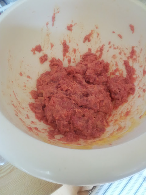 Da var farsen mekka ferdig. Salt og pepper hadde jeg i først og knadde i vei. Deretter melk, flytende melange, 1 egg og noen SS med potetmel. Wolla! Jeg lager hjemmelagde kjøttkaker uten oppskrift. Hvorfor?