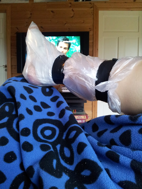 Måtte selvsagt få hjelp av min kjære med å teipe og sikre bandasjen at den ikke ble våt.
