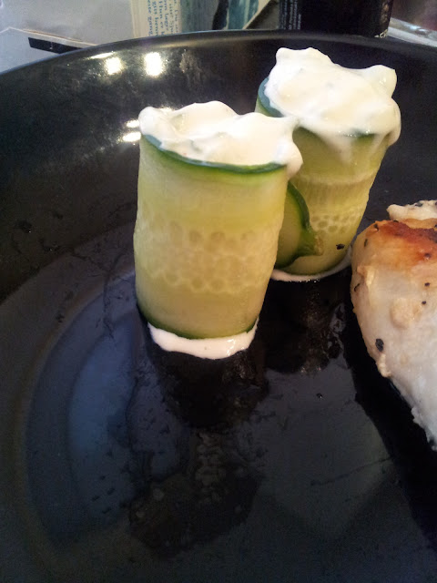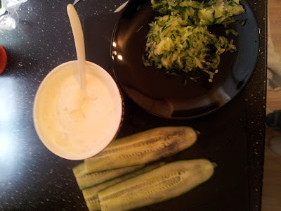 Her har jeg skjært agurken med en osthøvel og laget en slags dressing som jeg skal fylle de med. Grovraspet agurken jeg skal ha i dressingen.
