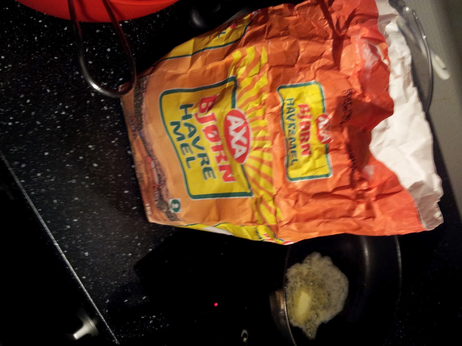 2 Egg, 3 Dl melk, havremel på feelingen, kanel og kardemomme på feelingen.
